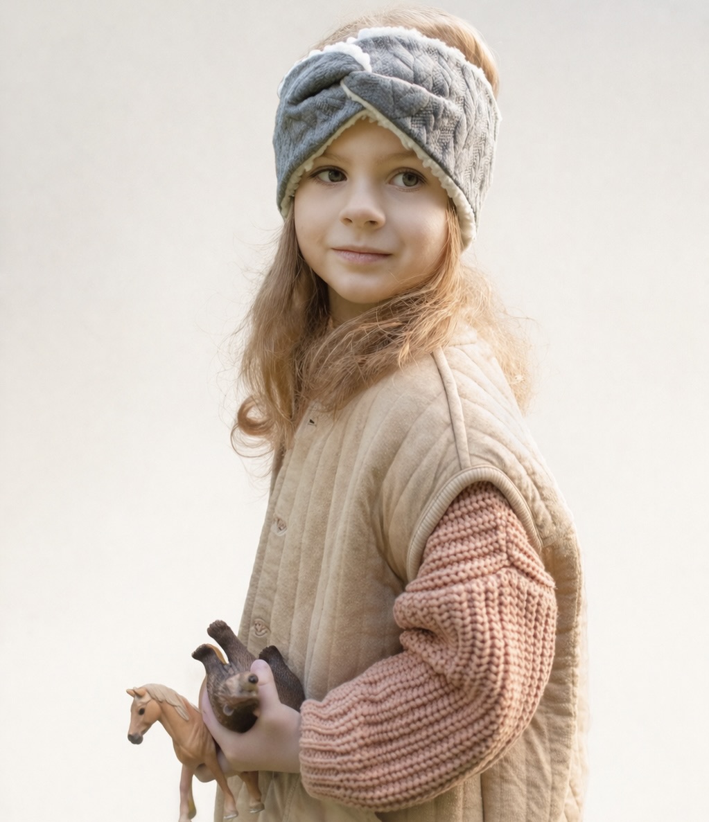 Detská zimná čelenka zo svetroviny zo svetroviny a zabezpečte ochranu uší počas chladných dní. Čelenka udržiava teplo a zároveň umožňuje pohodlné nosenie bez potreby čiapky.