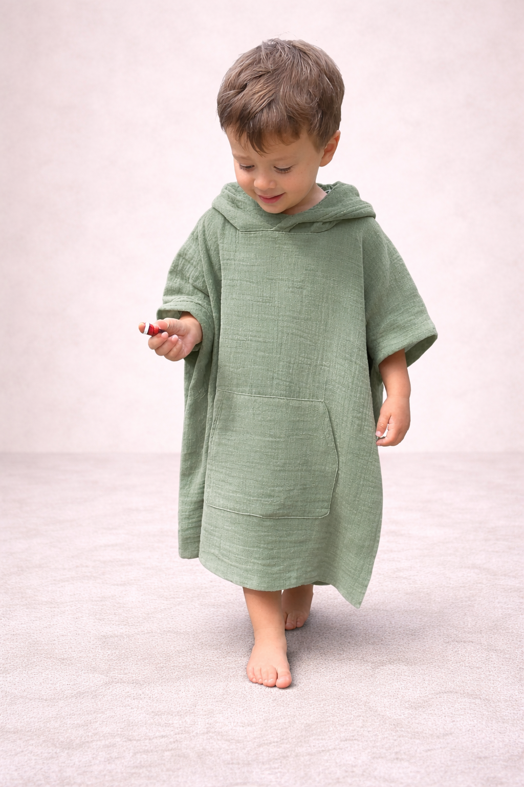 Naše mušelínové detské pončo šijeme s dôrazom na pohodlie a praktickosť. Vyrábame ho v t veľkostiach od Xs až po L aby sme zabezpečili ideálne padnutie pre deti rôzneho veku. Kapucňa poskytuje ochranu pred slnkom, vetrom či jemným dažďom, zatiaľ čo vrecko vpredu umožňuje deťom ukryť malé poklady alebo si ohriať ruky. Mäkký mušelín jemne objíme detskú pokožku, a to aj počas horúcich letných dní.